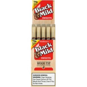 Average quality at a low price. Value priced and available in boxes of 25 or sets of 10 convenient 5 packs and featuring your choice of clean tasting plastic or wood tips black mild bridges the gap between pipe and cigar smoking in a very satisfying and highly aromatic way.