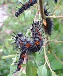 Black and orange striped caterpillar with spikes Cecropia moth caterpillars are quite large measuring up to 4 5 inches.