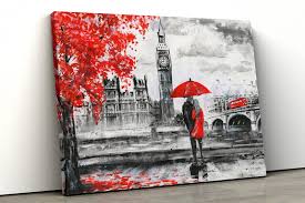 Black and white canvas pictures of london London rain black white red canvas wall art picture print.