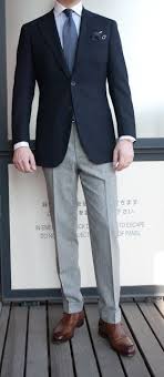 Black blazer grey pants blue shirt. It s commonly said that when a man first ventures into the world of tailored clothing or into the working world that demands such a dress code he should begin with a navy blue suit. Combine the blazer with the white pants and the grey v neck t shirt. May 19 2020 explore jacob henderson s board blue jacket gray pants on pinterest. Stay away from navy and dark brown pants.